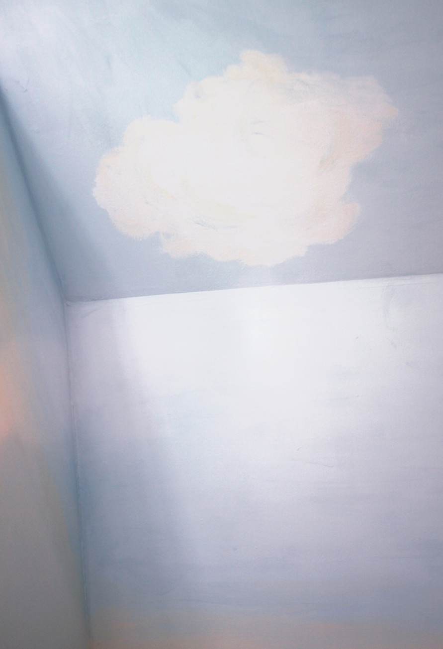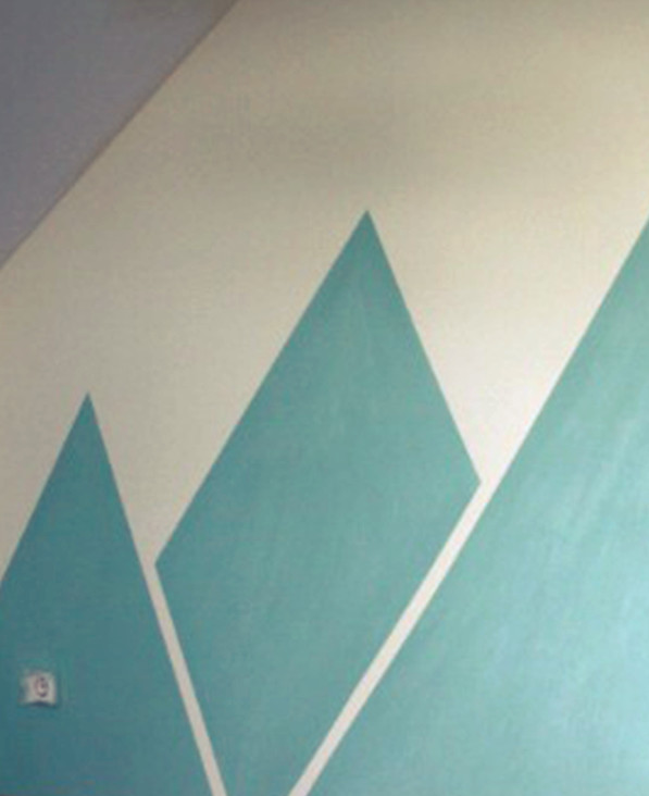 „Geckogrün“ war für mich die perfekte Farbe für die Berge bzw. für den unteren Teil des Zimmers, eine Mischung aus Blau und Grün, somit nichts Halbes und nichts Ganzes, eine Farbe, die gerade deswegen auch perfekt mit kräftigen Farben wie Rot, Orange oder sogar Gelb und Grün harmoniert. Kängurubeige sollte als dezente ‚Sonne‘ im oberen Teil des Zimmers gestrichen werden, auch, um es heller zu machen. Das Libellenblau ist ein so schönes Hellblau, dass ich es in einen Himmel mit alpinaweißen und kängurubeigen Wolken verwandelt habe.
