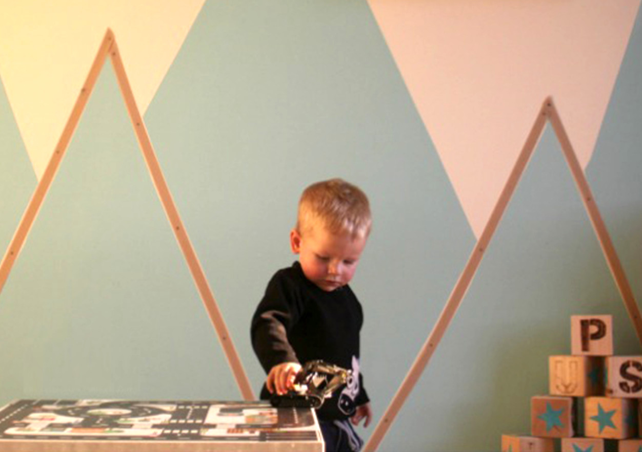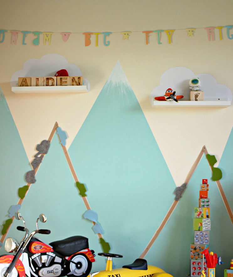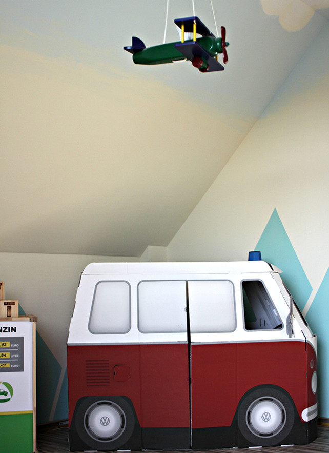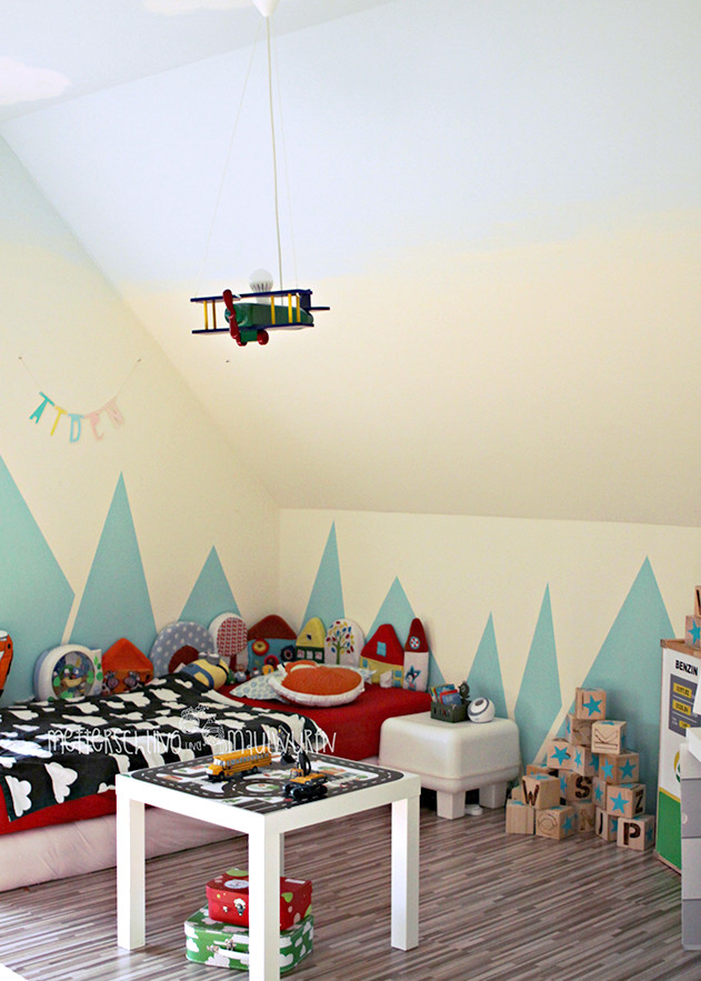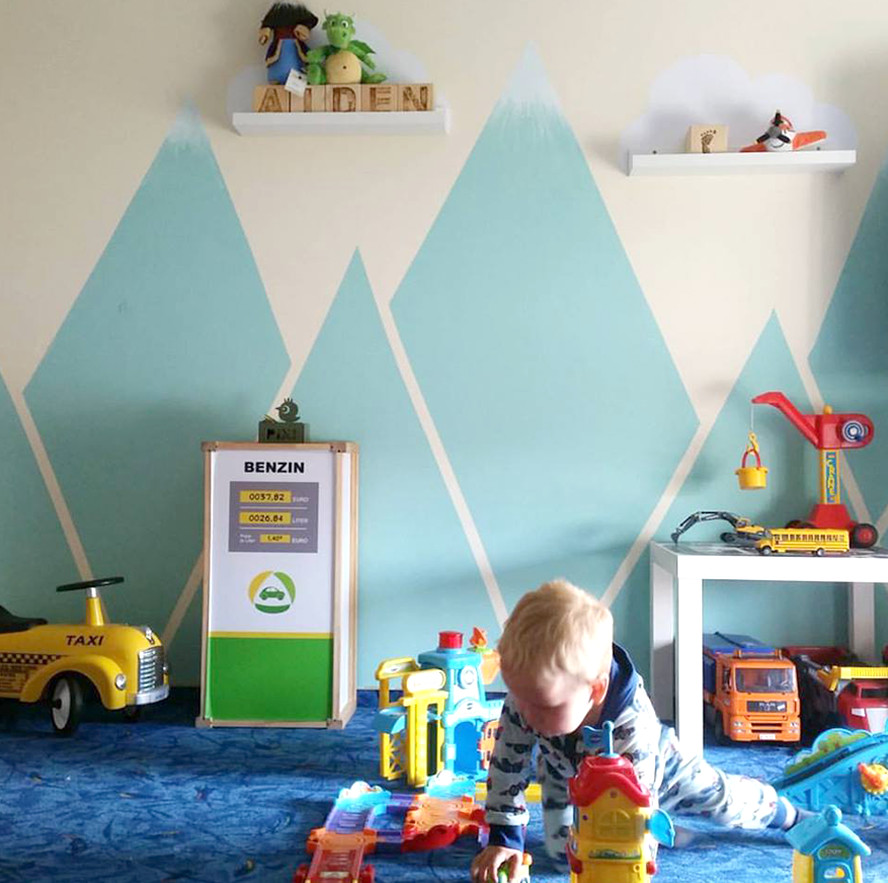 Bye bye Babyzimmer, hallo Kleinkind-Zimmer (inklusive Familienbett). Zu seinem 2. Geburtstag wurde das Zimmer unseres Sohnes neu renoviert. Denn mittlerweile hatte sich herauskristallisiert, wofür er eine Leidenschaft hegt: Autos, Bagger und Züge. Da ich großer Fan thematischer Zimmer bin, war für mich direkt klar: es kommen Berge an die Wand. Eine schlichte, aber auffallende Landschaft, die sich wunderbar mit Straßen und Fahrzeugen verbindet. Sein Zimmer sollte ein Jungenzimmer werden, aber nicht zu einfarbig. Wir lieben bunt.