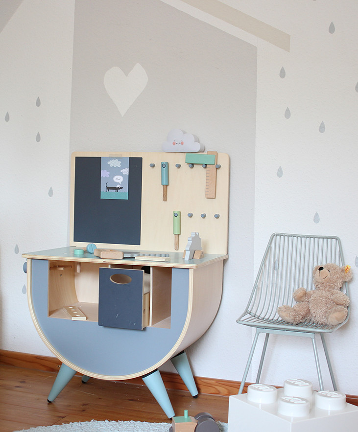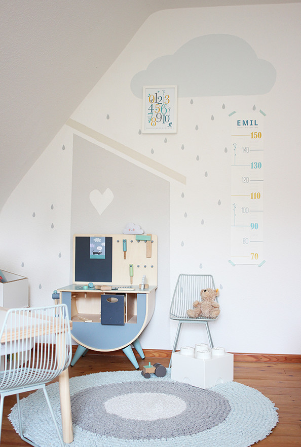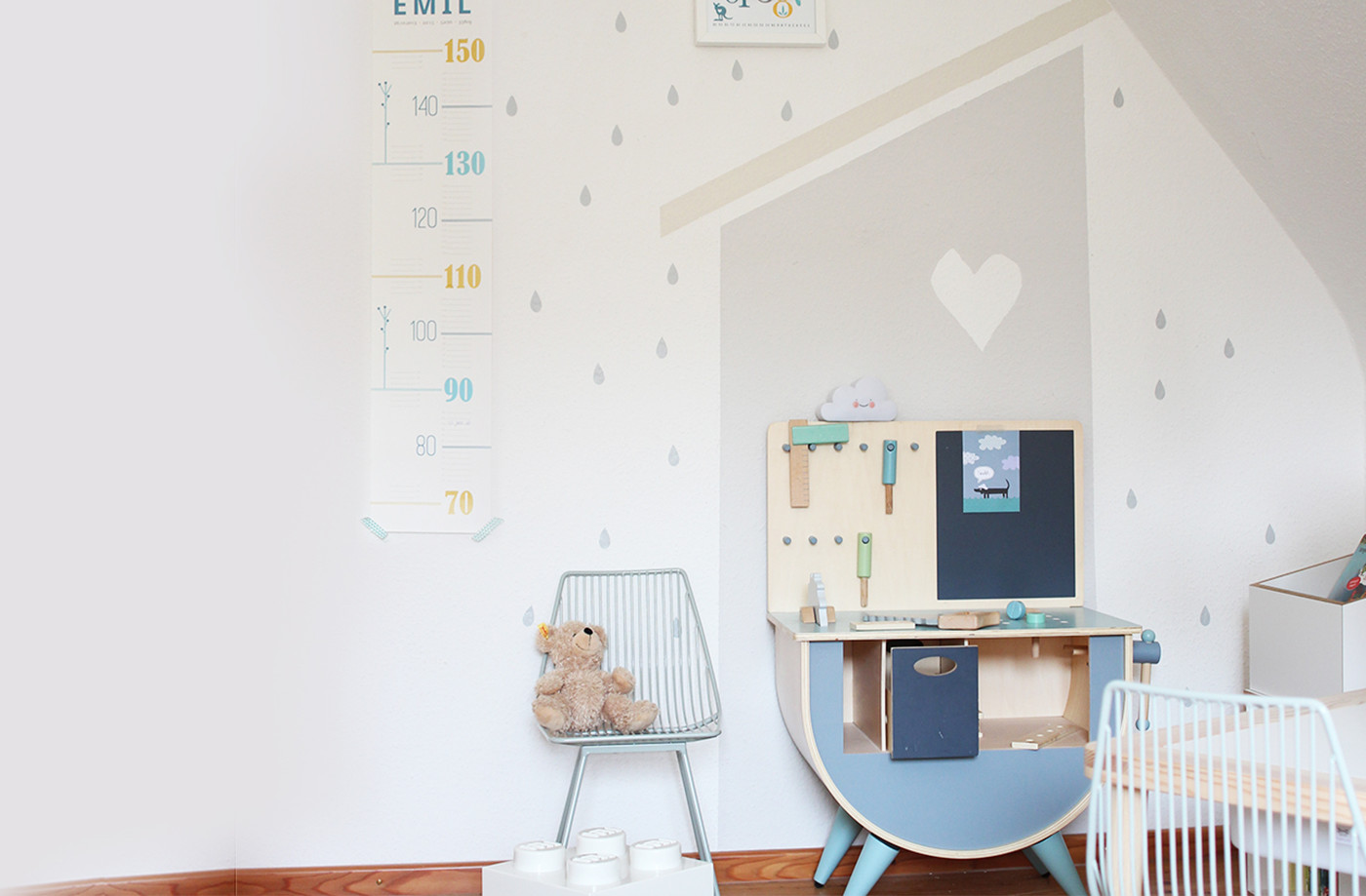 Ich liebe es auch, mich in den Kinderzimmern auszutoben, und das kann man erstaunlich oft, denn die Bedürfnisse der kleinen Bewohner ändern sich so schnell. Eigentlich ist es Emils Kinderzimmer, aber da wir gerade am Renovieren sind und Paul daher noch kein Zimmer hat, ist es momentan ein gemeinsames Kinderzimmer. Bisher schläft allerdings nur Emil dort. Wir überlegen noch, ob die beiden zusammen schlafen sollen und es ein gemeinsames Spielzimmer geben sollte, oder ob beide ihr eigenes Zimmer bekommen.
