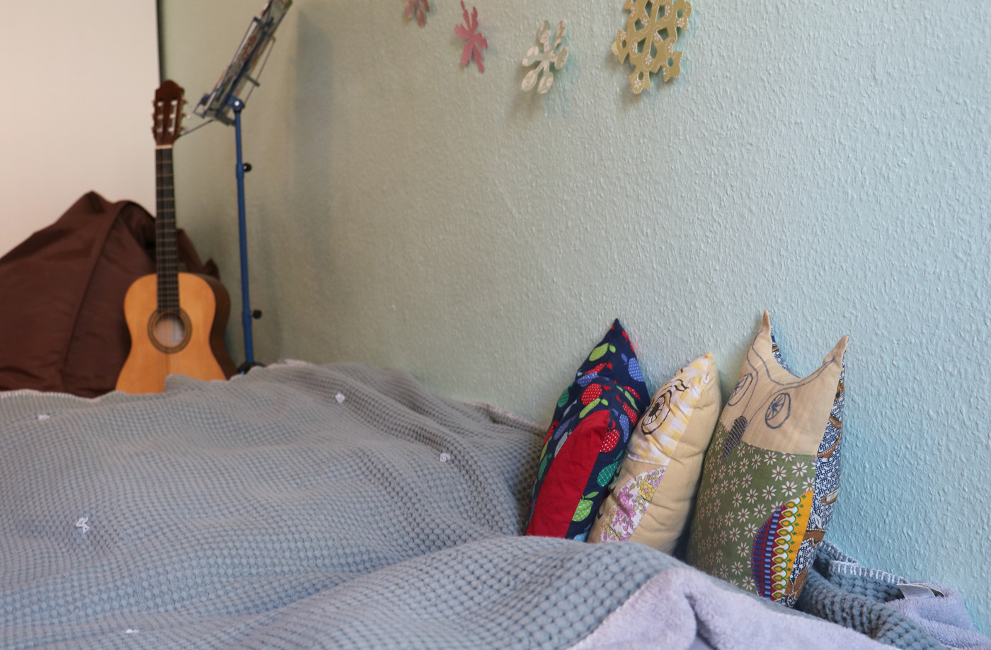 Wir wollten ruhige Farben, die zu uns und unseren agilen Kindern passen, aber in den Kinderzimmern dennoch etwas Auffallenderes. „Delphinblau“ beim vierjährigen Söhnchen sollte unsere Liebe zum Wasser an der Wand fortführen, bei den acht- und elfjährigen Mädchen zwitschert es halbhoch in „Kolibrigrün“ an den Wänden. In allen Kinderzimmern haben wir die Farben mit Schutzheld überstrichen, um die Wände etwas mehr zu schützen. Im Flur zu dem Zimmer haben wir das sanfte „Elefantengrau“ halbhoch gestrichen, um einen leichten Kontrast zum Weiß und den hohen Decken zu haben.