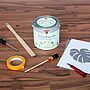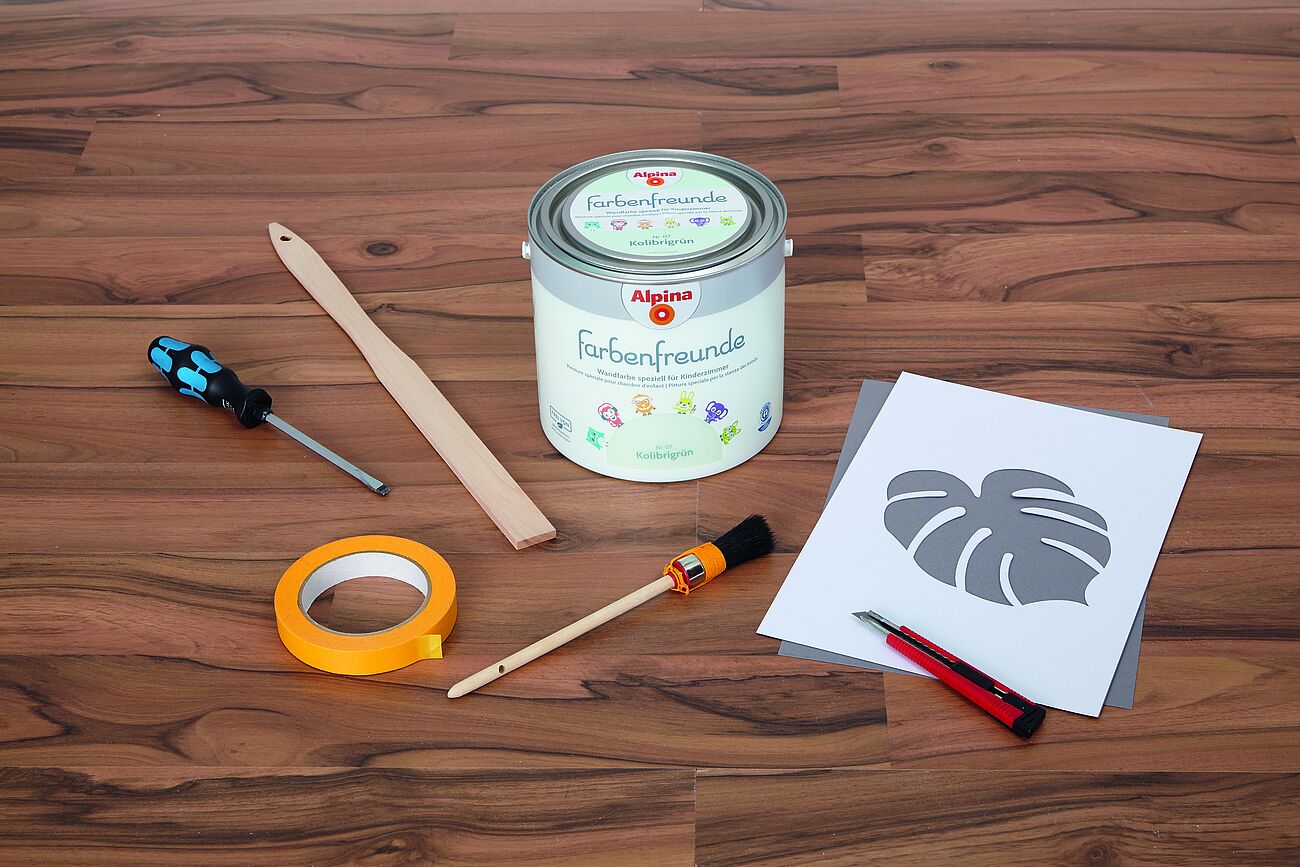 Viel braucht es nicht für die DIY Vorbereitung: Wandfarbe, Abklebeband, Cuttermesser, Fotokarton, Rührholz, Pinsel und die Wandschablone aus Papier.