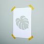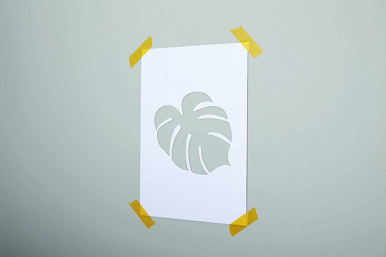 Schablone auf den Fotokarton kleben und mit dem Cuttermesser ausschneiden. Anschließend mit Abklebeband an der Wand fixieren.