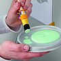Von innen nach außen die Farbe auftupfen, dabei den Pinsel senkrecht halten und nicht hin- und herstreichen. Sonst verläuft die Farbe unter der Schablone.