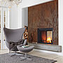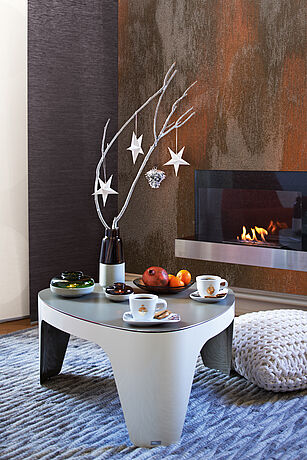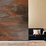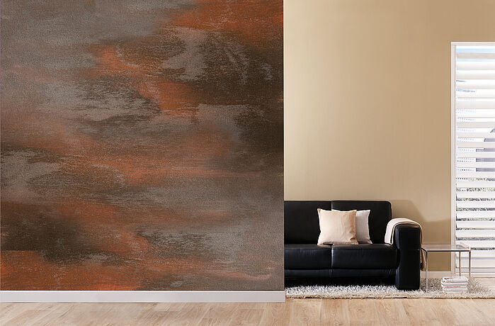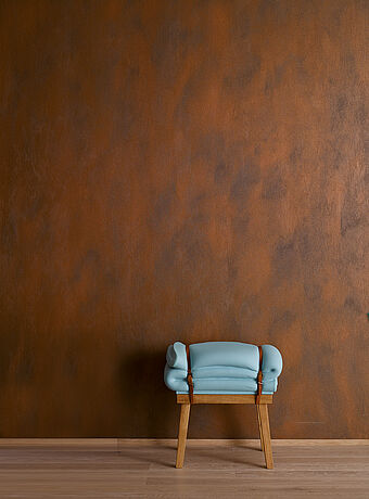 Das Gegenmittel: Mit einer Akzentwand in ROST-OPTIK verbinden Sie die warme, behagliche Wirkung von Braun mit einer ausdrucksvollen Textur, die den ganzen Raum belebt. Intensivieren lässt sich diese Wirkung mit Accessoires aus Messing und unbehandeltem Holz.