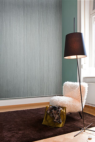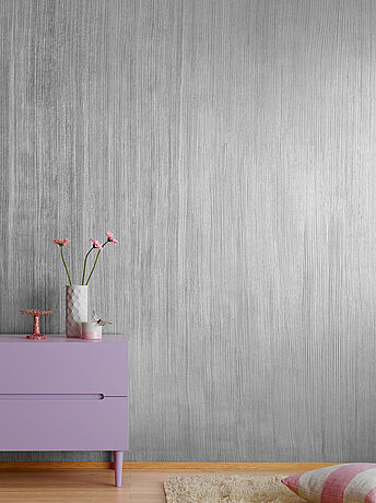 1. Farbe vor Gebrauch gut umrühren. Üblicherweise trägt man den METALL-EFFEKT Silber auf eine strukturierte Oberfläche auf, da hier der metallische Glanz am besten zur Geltung kommt – eine optimale Basis ist der Kreativ-Effekt LINIEN-EFFEKT. Zum Auftragen der Materialien benötigen Sie nur noch den Alpina Roller und den Alpina Effekt-Kamm.