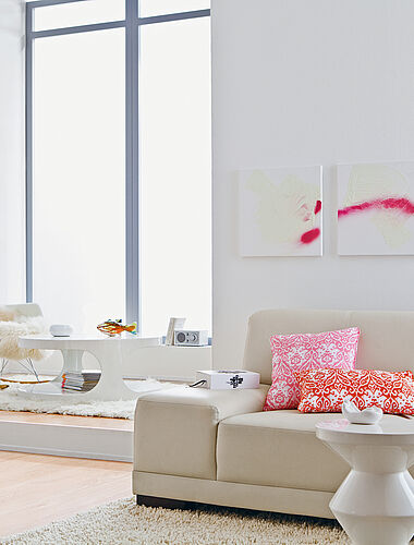 Weiß wird in der Inneneinrichtung gern als neutrale Leinwand eingesetzt, die Möbel oder Buntes zum Leuchten bringt. Als neutral kann man es aber gar nicht bezeichnen, da ein reines Weiß in der Natur nicht vorkommt. So haben weiße Blumen einen leichten Grünstich und weißes Fell hat meist einen bräunlichen Touch. Ein harmonisches Wohngefühl erreicht man daher am besten mit einem Off-White, wie Muschelweiß der Serie Alpina Farbrezepte. Wer einen Raum komplett Weiß-in-Weiß gestalten möchte und die Möbel und Accessoires schon in einem Off-White gewählt hat, der sollte bei den Wänden wiederum auf das klassische Alpinaweiß zurückgreifen. So erzielt man geringe Farbimpulse, die für Wohlfühlstimmung sorgen. Um einem weiß gestrichenen Raum seine Sterilität zu nehmen, setzt man ihm einfach Natürlichkeit entgegen. Wärmende Elemente wie weiche, wollige Stoffe, helle Ledermöbel und unbehandeltes Holz sind die besten Gegenpole eines kühlen Ambientes. Grünpflanzen und Blumen sowie Leinen, Sisal und Nesselstoff unterstreichen den natürlich-lockeren Stil. Der Geschmack geht doch eher Richtung Minimalismus? Dann bietet es sich an, verschiedene Weiß-Tönungen miteinander zu kombinieren, wie zum Beispiel Schneeweiß, Elfenbein und Silber-Weiß. Das Ergebnis: ein spannender Kontrast und dennoch ein cleanes Gesamtbild. Zusammen mit hellem Grau, Gold oder Silber bekommt der Raum einen urbanen, mit Champagner-, Creme- und Oliv-Tönen hingegen einen klassischen Charakter. Schwarz und Pastell-Töne zum dominierenden Weiß erzeugen einen jungen Look, ein rauchiges Rosé sorgt für Landhaus-Flair. Diese und weitere Tipps zu Farben und ihren Wirkungen gibt es unter www.alpina-farben.de.