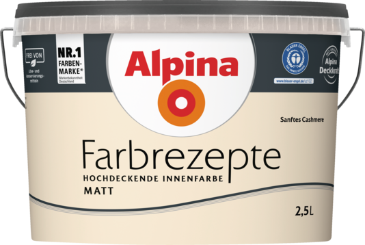 Alpina Farbrezepte „Sanftes Cashmere“ ist ein heller Creme-Ton, der als Flächenton eine freundliche Atmosphäre schafft. Er lässt sich aber auch nach Wunsch mit nahezu allen Akzent- und Begleittönen kombinieren. Sein sanfter, weicher Charakter wird besonders in Kombination mit den Farbtönen der Farbrezepte „einfach lebendig“ und „einfach geborgen“ betont.