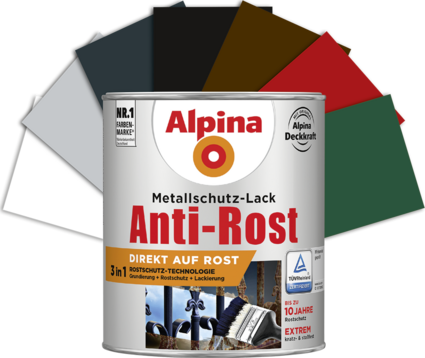 Die 3in1 Rostschutz-Technologie (Grundierung + Rostschutz + Lackierung) der Alpina Metallschutz-Lacke vereint eine ausgezeichnet haftende Grundierung mit einem wirkungsvollen Langzeit-Korrosionsschutz und einer dickschichtigen Lackierung. Dadurch und durch die Anwendung direkt auf Rost verringert sich der Zeitaufwand gegenüber herkömmlichen Lacken deutlich.