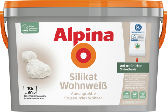 Alpina Silikat Wohnweiß ist eine atmungsaktive, hochdeckende weiße Wandfarbe auf natürlicher Silikatbasis, die ein besonders angenehmes Raumklima schafft.